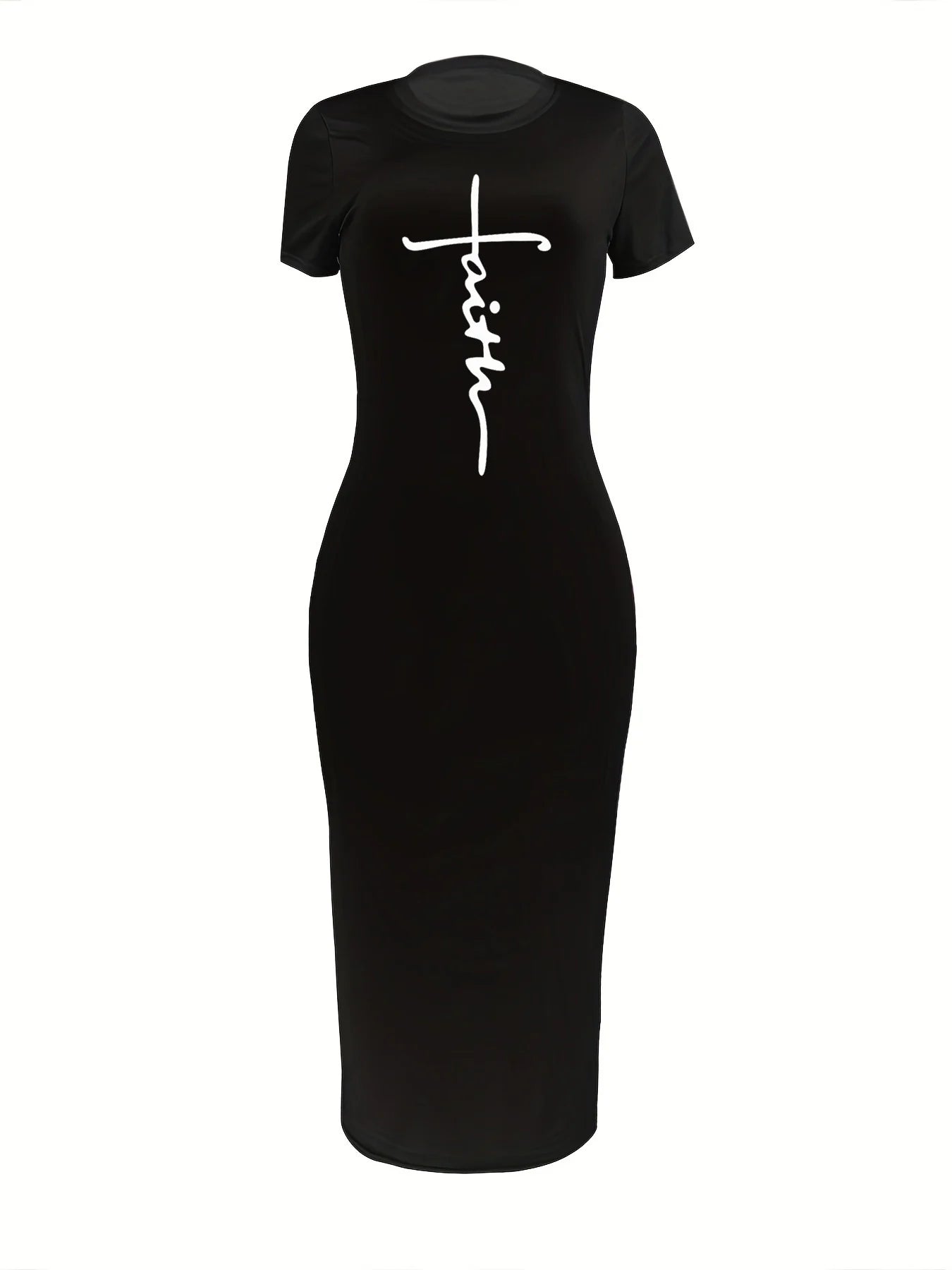 Grace meets confidence in this Faith Short-Sleeved Fitted Dress, designed for the woman who carries her beliefs boldly and beautifully. This sleek sheath dress features a flattering slim fit with slight stretch, perfect for church, gatherings, or uplifting everyday wear. Its mid-calf length and modest silhouette provide both style and substance. Size up for a more relaxed fit.